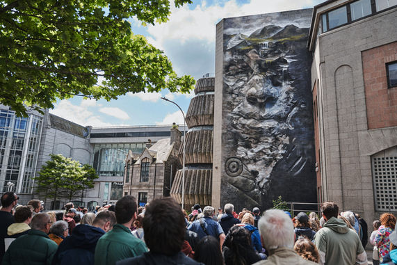 Monumental public artist exploring cultural memory, myth and identity through murals and carved stone .